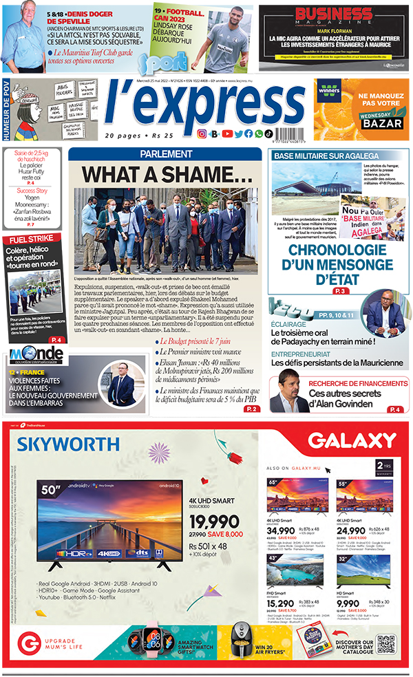 En une de l'express: Parlement: what a shame… ; Autre titre: Base militaire sur Agalega: chronologie d’un mensonge d’état