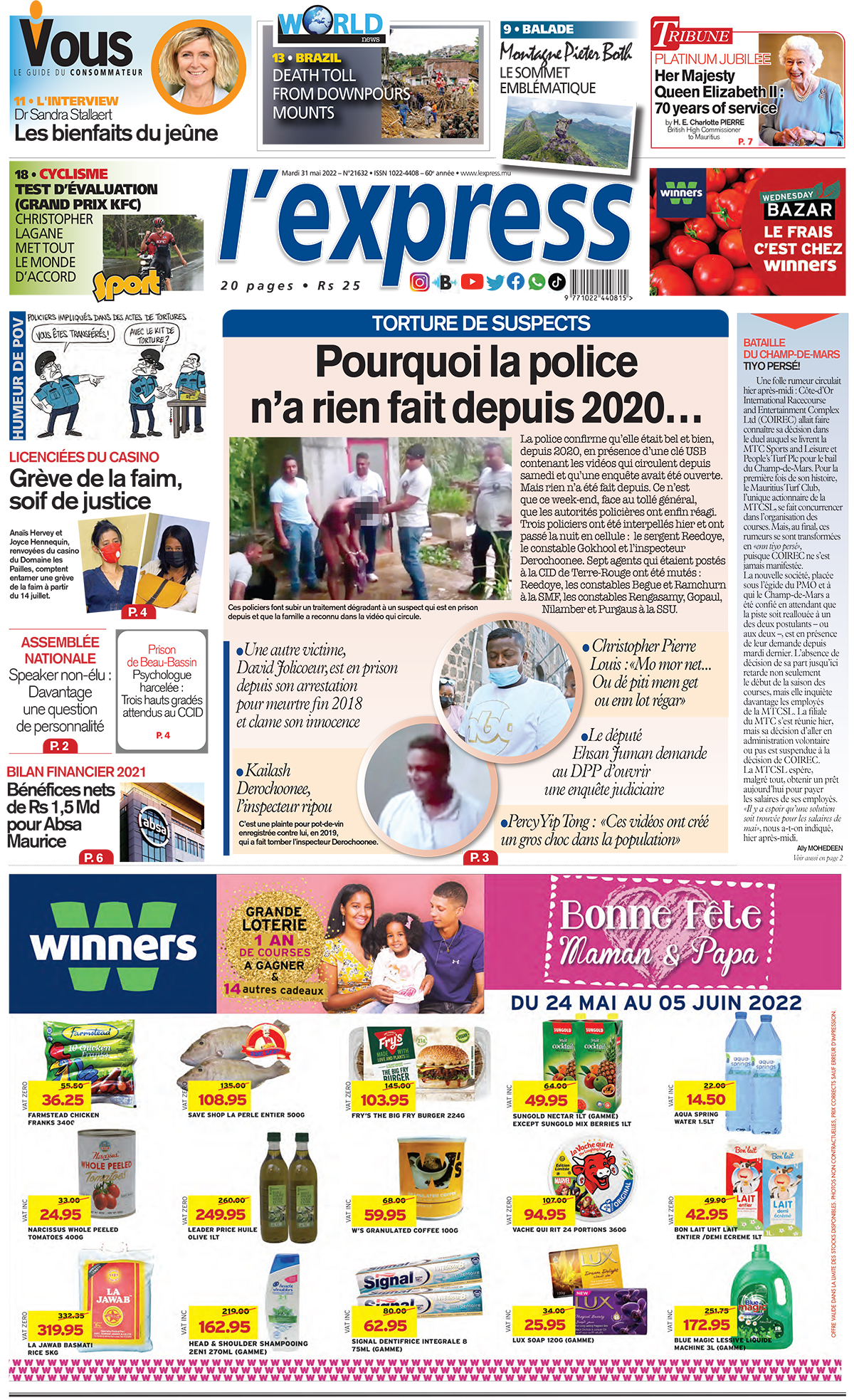 En une de l'express: Torture de suspects : Pourquoi la police n’a rien fait depuis 2020… ; Autre titre: Licenciées du casino : Grève de la faim, soif de justice.