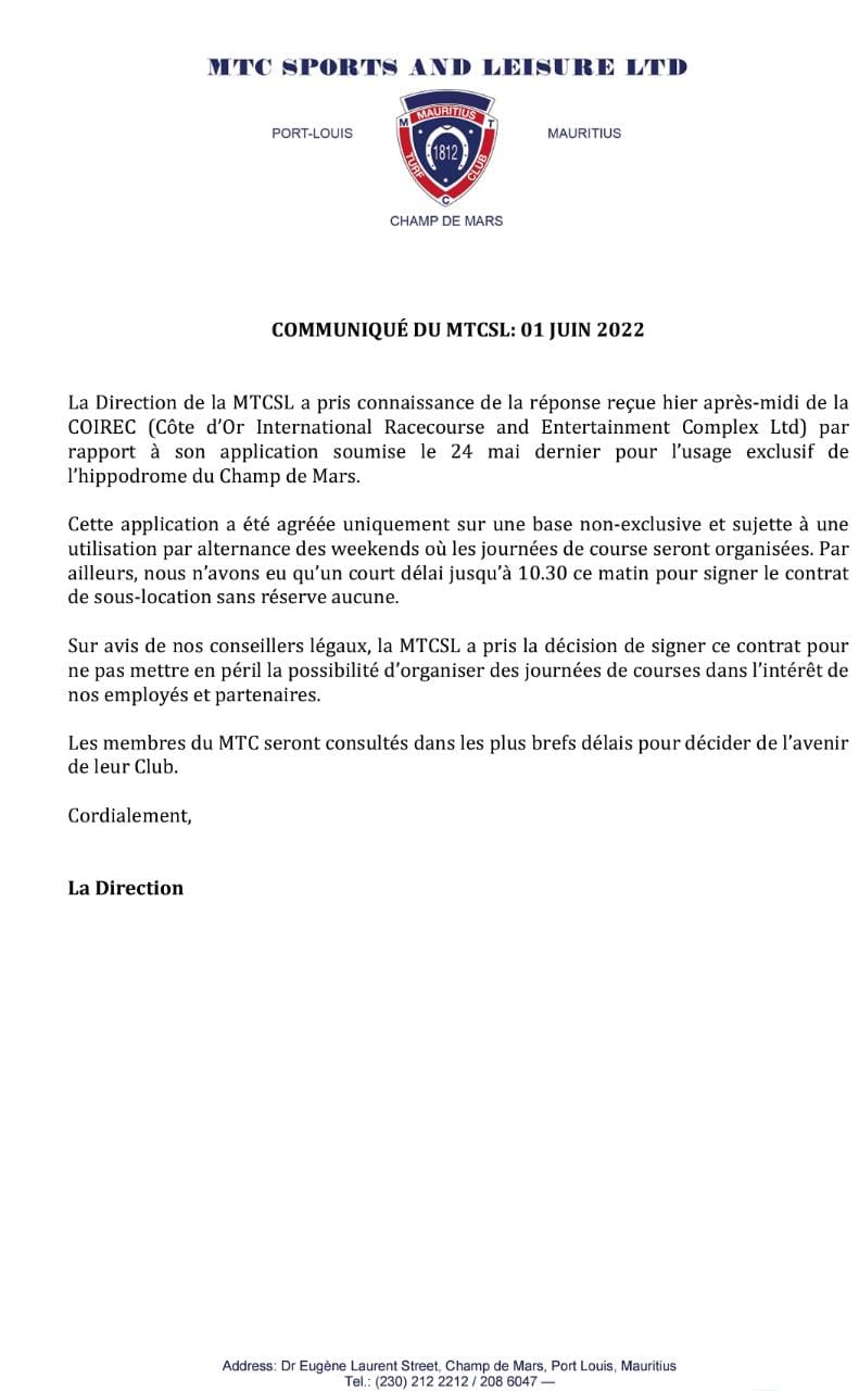 MTCSL ajoute que c’est sur avis de ses conseillers légaux qu’elle a décidé de signer l’accord, « pour ne pas mettre en péril la possibilité d’organiser des journées de courses dans l’intérêt des employés et partenaires ». Les membres du MTC doivent encore se réunir pour décider de l’avenir du club.