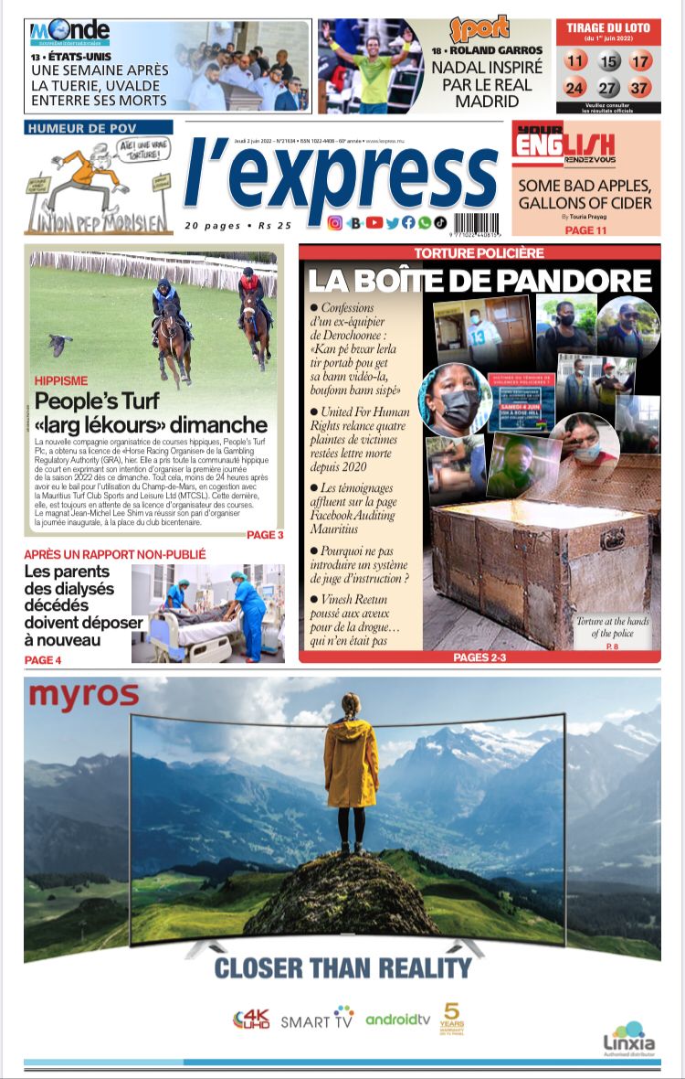 En une de l'express: Torture policière: La boîte de pandore; Autre titre: Hippisme - People’s Turf: «larg lékours» dimanche