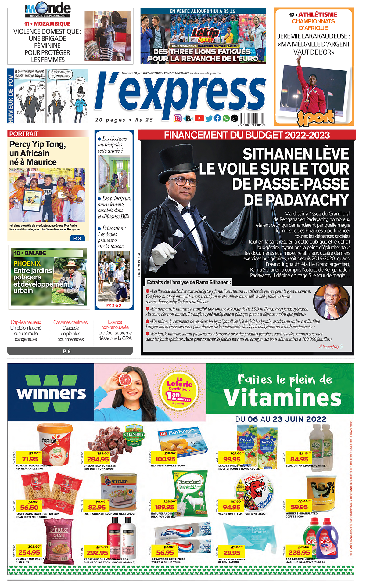 En une de l'express: Financement du budget 2022-2023 : Sithanen lève le voile sur le tour de passe-passe de Padayachy; Autre titre: Portrait : Percy Yip Tong, un Africain né à Maurice.