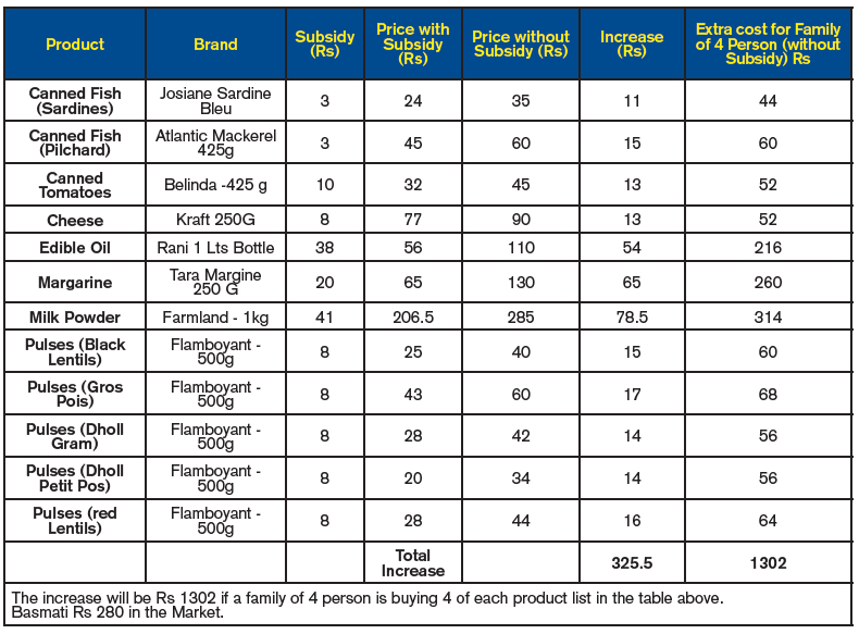 Le ministre du Commerce a précisé que «si les subsides avaient été maintenus pour la prochaine année financière, cela aurait été insoutenable car cela aurait coûté Rs 4,8 milliards, en assumant que les prix ne grimpent pas». Dans la foulée, il a cependant rajouté que les prix de ces sept produits seront fixés, sans en préciser les montants.