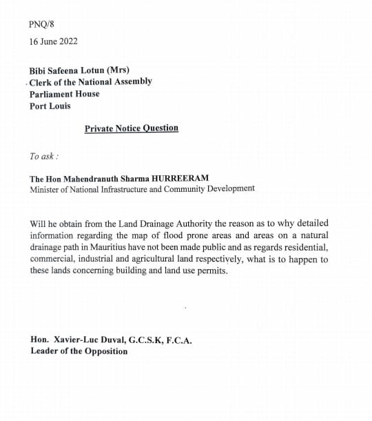 Les travaux parlementaires reprennent ce jeudi 16 juin avec la Private Notice Question (PNQ) sur les régions inondables lors des grosses pluies. Le Leader de l'opposition Xavier-Luc Duval adressera sa PNQ au ministre des Infrastructures nationales Bobby Hurreeram et lui demandera notamment pourquoi la Land Drainage Authority n'a pas rendu publique la carte des zones inondables mais surtout celle des drains naturels où des bâtiments commerciaux, résidentiels, industriels et autres ont poussé comme des champignons. Cela, dans bien des cas, avec un «Building and Land use permit» délivré par les autorités.