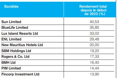 Les dix constituants du SEMDEX les plus performants en termes de rendement total depuis le début de l’année indiquent des performances variant de 13,90 % à 40,53 %. Ces sociétés opèrent dans divers secteurs d’activités, comme indiqué dans le tableau ci-contre.