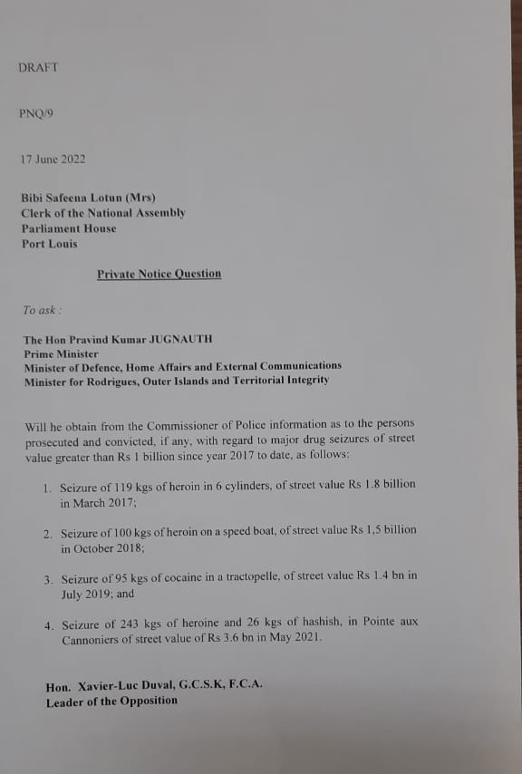 Où en sont les enquêtes ? A-t-des pistes concernant la saisie des 95 kilos de cocaïne valant 1.4 milliard, à bord d’une tractopelle, en 2019, notamment ? Ou encore la saisie de 119 kilos d’héroïne, valant Rs 1.8 milliard, dans 6 cylindres de gaz en 2017 ? Comment se fait-il que la police n’ait pas encore attrapé les gros requins ? Des questions que le leader de l’opposition, Xavier-Luc Duval, posera au Premier ministre au Parlement, en ce vendredi 17 juin. Voir l’énoncé de la PNQ ci-dessous :