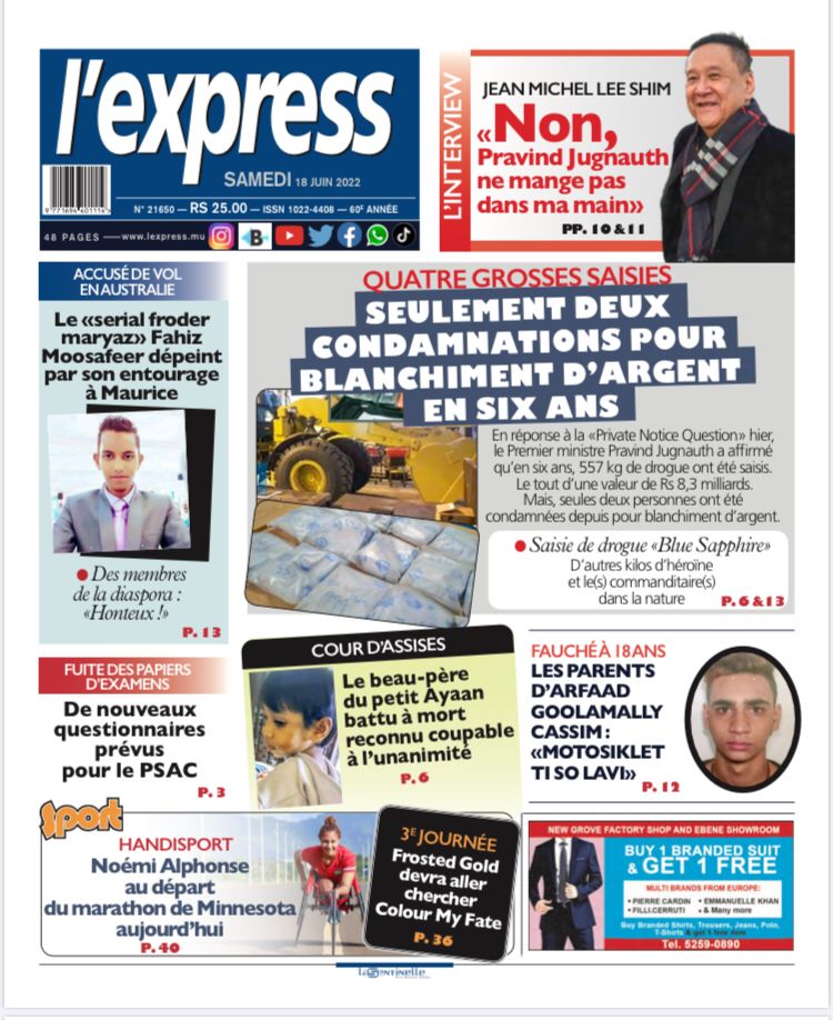 En une de l'express: Quatre grosses saisies: Seulement deux condamnations pour blanchiment d’argent en six ans; Autre titre: Accusé de vol en Australie: Le «serial froder maryaz» Fahiz Moosafeer dépeint par son entourage à Maurice
