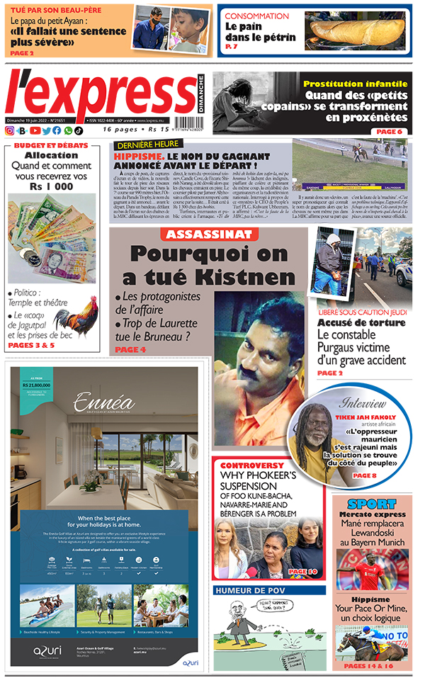 En une de l'express: Allocation: quand et comment vous recevrez vos Rs 1 000 ; Autre titre: Assassinat: pourquoi on a tué Kistnen