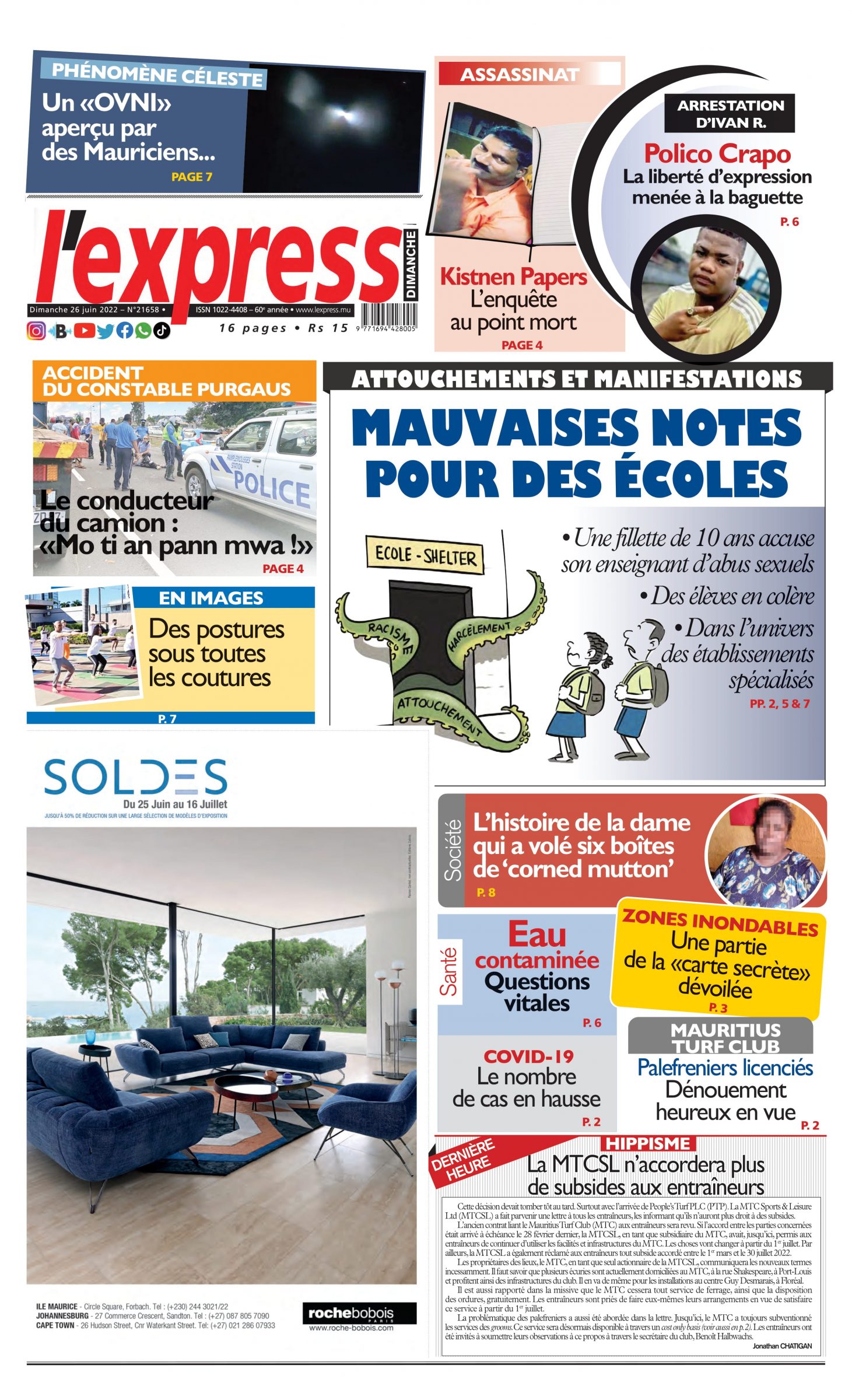 En une de l'express; Attouchements et manifestations: Mauvaises notes pour des écoles; Autre titre; L’histoire de la dame qui a volé six boîtes de ‘corned mutton’.