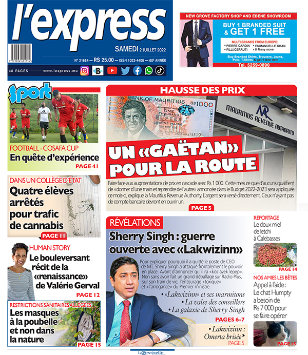 En une de l'express: Hausse des prix: un «Gaëtan» pour la route ; Autre titre: Sherry Singh: guerre ouverte avec «Lakwizinn»