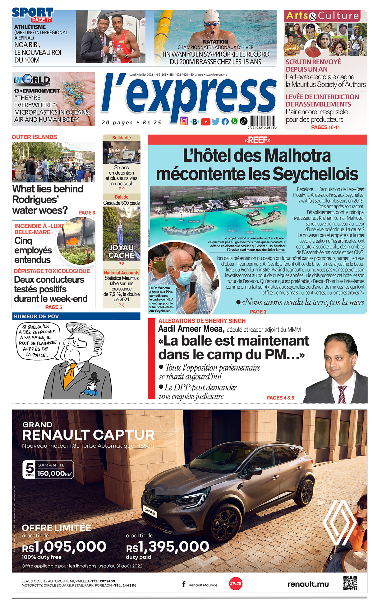 En une de l'express: «Reef» : L’hôtel des Malhotra mécontente les Seychellois; Autre titre: Allégations de Sherry Singh - Aadil Ameer Meea, député et leader-adjoint du MMM : «La balle est maintenant dans le camp du PM…».