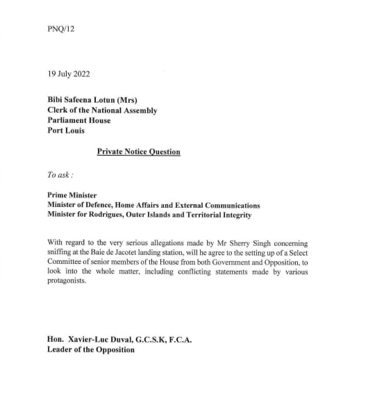 Ce mardi 19 juillet, Xavier-Luc Duval adressera sa PNQ à Pravind Jugnauth. Il demandera au Premier ministre s’il acceptera de mettre en place un «select committee» composé de membres du gouvernement et de l’opposition pour la lumière sur les dénonciations de Sherry Singh, surtout en présence de versions contradictoires des protagonistes.