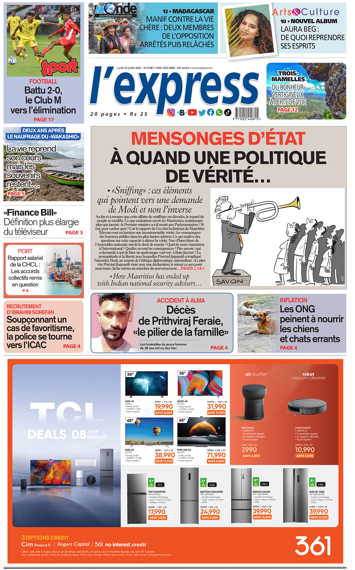 En une de l'express: Mensonges d’état : À quand une politique de vérité…; Autre titre: Inflation : Les ONG peinent à nourrir les chiens et chats errants.