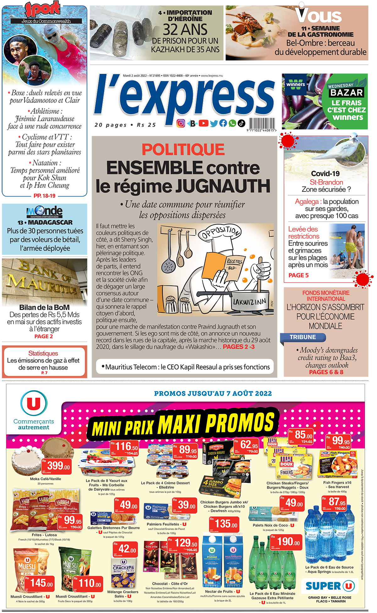 En une de l'express: Politique : Ensemble contre le régime Jugnauth; Autre titre: Bilan de la BoM : Des pertes de Rs 5,5 Mds en mai sur des actifs investis à l’étranger.
