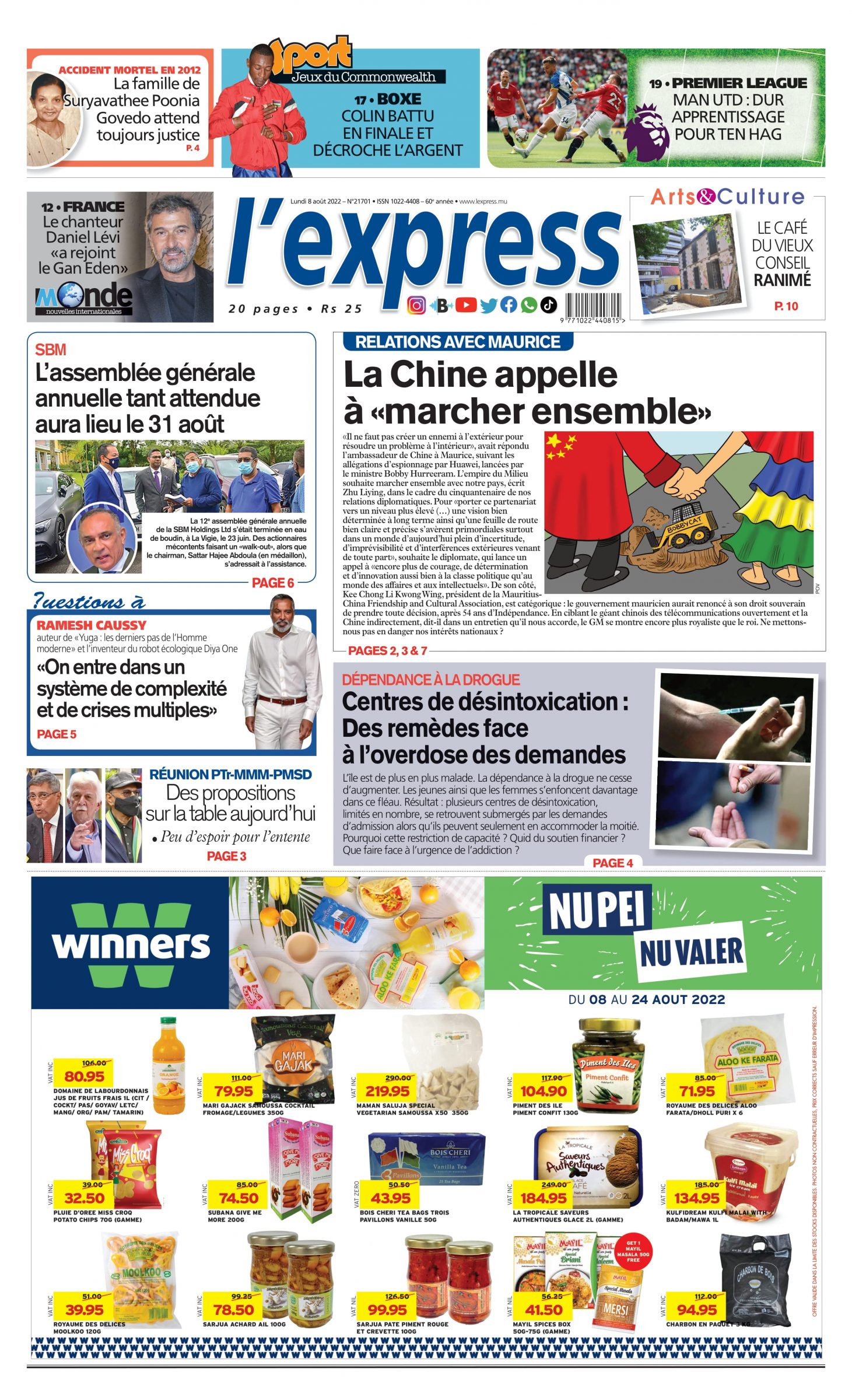 En une de l'express: La Chine appelle à «marcher ensemble»; Autre titre; Centres de désintoxication : Des remèdes face à l’overdose des demandes.