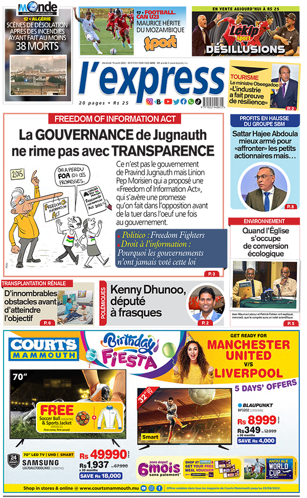 En une de l'express: Freedom of Information Act: la GOUVERNANCE de Jugnauth ne rime pas avec TRANSPARENCE ; Autre titre: Polémiques: Kenny Dhunoo, député à frasques