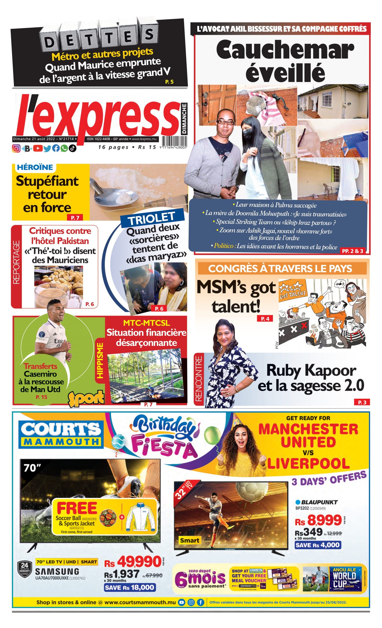 En une de l'express; L’avocat Akil Bissessur et sa compagne coffrés:Cauchemar éveillé; Autre titre:Congrès à travers le pays: MSM’s got talent!