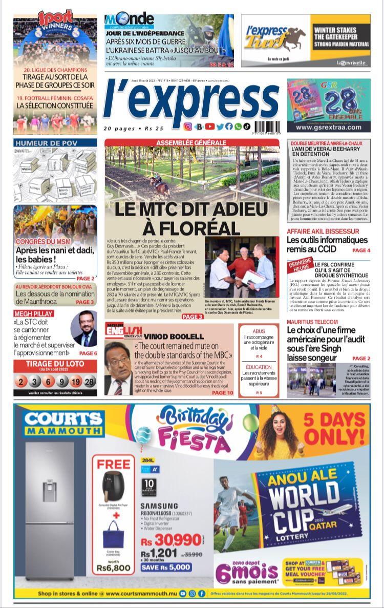 En une de l'express: Assemblée générale: le MTC dit adieu à Floréal; Autre titre: Vinod Boolell: «The court remained mute on the double standards of the MBC»