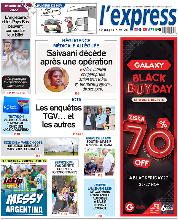 En une de l'express: Négligence médicale alléguée: Saivaani décède après une opération ; Autre titre: ICTA: les enquêtes TGV… et les autres