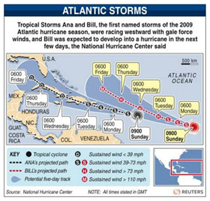 Jeff Masters, spécialiste des ouragans et fondateur du site météo "The Weather Underground", prévoit que Bill passera entre les Bermudes et la côte est des Etats-Unis pour se diriger au Nord, vers les provinces maritimes canadiennes.