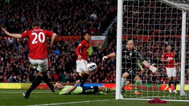 Le titre était déja dans la poche pour les Red Devils à la demi-heure de jeu après un festival de leur buteur néerlandais, qui a frappé victorieusement trois fois aux 2e, 13e et 33e minutes.