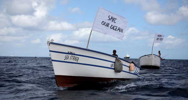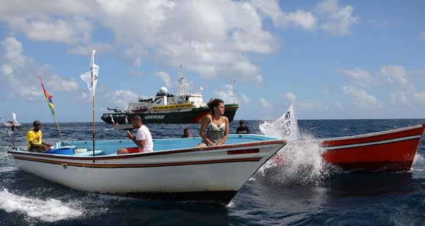 Pêche industrielle: une flottille de Greenpeace proteste au large de Grand-Baie
