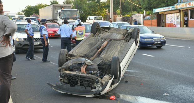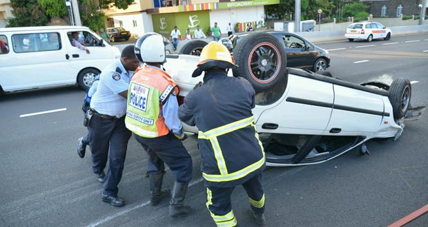 Après une collision survenue mercredi entre un autobus de la Compagnie nationale de transport et deux véhicules, un autre accident est survenu à Pailles, ce vendredi 20 décembre. Alors qu’il voulait éviter une collision avec une voiture, un automobiliste a perdu le contrôle de sa «Rover». Celle-ci a heurté un parapet, avant de se retrouver les quatre roues en l’air.