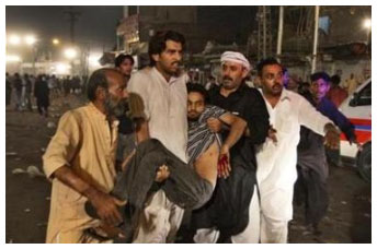 Près de 35 000 Chiites participaient à la procession dans les rues de Lahore, au cours de la procession traditionnel pour le calife Ali.  A la suite des explosions, une foule en colère a agressé des membres des forces de l''ordre, incendié un commissariat de police et plusieurs véhicules, rapportent des témoins.