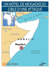 Un représentant de la mission de l''''Union africaine en Somalie (Amisom) a confirmé ce bilan. "Deux assaillants, l''un avec une grenade et l''autre qui ouvrait le feu, ont pénétré dans l''hôtel", a précisé le porte-parole de l''Amisom.