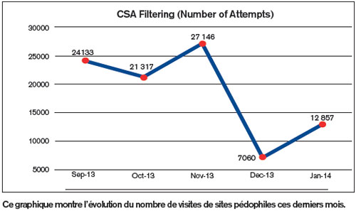 Les visites de sites pédophiles sont en hausse. Ce nombre est passé de 7 060 en décembre à 12 857 en janvier, soit 5 797 de plus. Durant la même période, l’accès à ces contenus pédophiles a été refusé à un millier d’adresses IP. L’accès à 1 306 sites listés a par ailleurs été bloqué durant cette période.