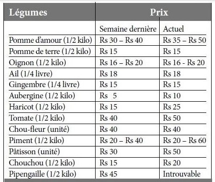 Des augmentations de prix entre Rs 5 et Rs 20 durant la semaine écoulée. Presque tous les légumes sont concernés. Un pâtisson se vend à Rs 50, contre Rs 30 la semaine dernière.