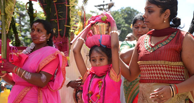 A Rose-Hill, alors que certains transportent des cavadees, cette fillette transporte des sombous – des pots en cuivre contenant du lait – sur sa tête.