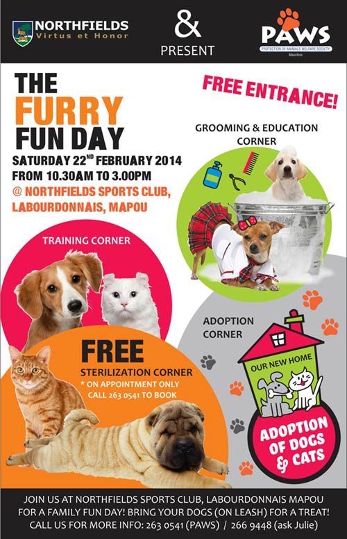Ce samedi 22 février, l’établissement scolaire Northfields, en collaboration avec PAWS, organise une journée familiale autour des animaux baptisée The Furry Fun Day. A cette occasion, le public pourra découvrir ou redécouvrir les divers services que propose l’association PAWS.