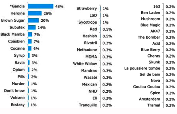 Respondents were asked what drugs are they aware of. Spontaneously, 47 different types of drugs have been mentioned by the interviewed sample. They tend to relate drugs to only illicit substances. Nearly one out of two mention Gandia/ Marijuana as a drug.