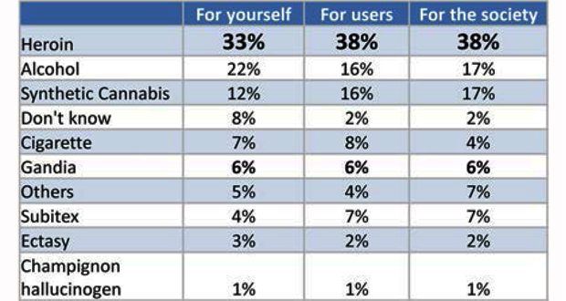 A list of drugs was read to respondents and they were asked to evaluate which drug is most dangerous for themselves, for the users and for the society. Heroin is perceived to being the most hazardous substance be it for respondents, for the users of heroin or for the society. Only 6% of the interviewed sample considered Gandia/Marijuana as dangerous.